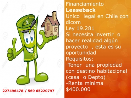 LEASEBACK PERSONAL, con fines generales, es un prestamo que se lleva a cabo mediante una propiedad habitacional . Este financiamiento entrega la posibilidad de la consolidación todas sus deudas”, y puede, generar recursos adicionales para que los ocupe en lo que considere importante, capital de trabajo, educacion, ....etc.