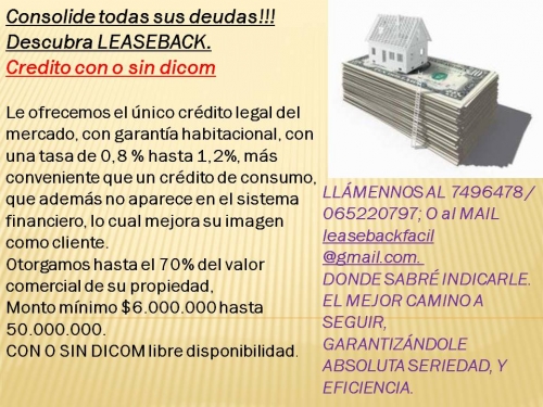NUEVO CREDITO!! CON O SIN DICOM La oportunidad que usted necesitaba? Es usted una de las tantas personas que viven el día a día presionado por las deudas, llamadas de cobranzas Etc. Lo invitamos a descubrir un producto innovador en Chile? LEASEBACK? Usted se preguntara ?Que es el LEASEBACK? ? El LEASEBACK es un crédito con garantía habitacional, que le otorga desde $ 10.000.000 hasta $ 50.000.000. Porque Adquirir este crédito? Cuales son las ventajas? ? Primero y lo mas importante este es un crédito legal y confiable, regulado por la SVS (superintendencia de valores y seguros) y la ley Leasing (19.281) Además aplicamos la tasa mas baja del mercado desde 0,8 % hasta 1,2 %, tome en cuenta que los bancos aplican mínimo el 2,3%. Quienes pueden optar a LEASEBACK ? Cualquier persona que tenga una propiedad habitacional propia o de un tercero(casa) que: * Este pagada por lo menos un 70% de su valor total ? *sea de material solido, por lo menos el primer piso.