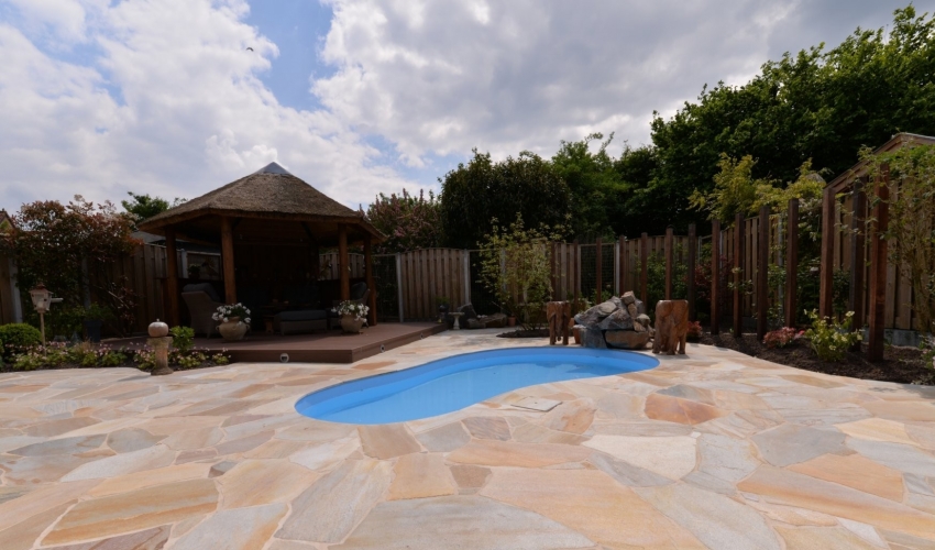 Gracias a su antideslizamiento se puede usar como suelo de piscina, también como acabados de chimeneas, bases o pilares de la construcción.