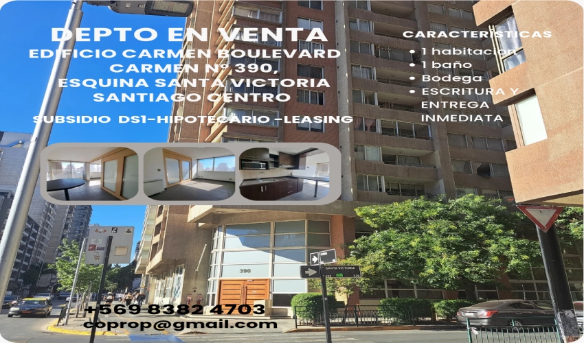 $65.000.000.- Se vende departamento 2 ambientes, 36 m2, ubicado en Edificio Carmen 390, construido año 2008, ubicado en calle Carmen 390 con Santa Victoria a 1 cuadra de Av. Santa Isabel, zona céntrica y comercial.
