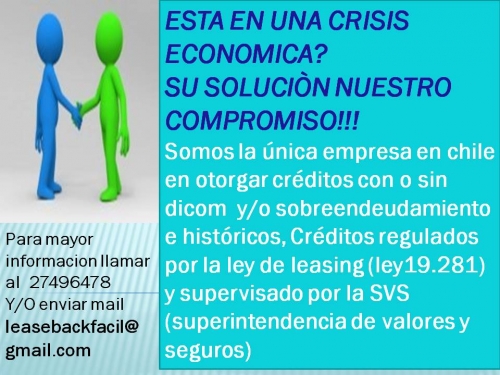 Somos la solucion a su problema financiero Te invitamos a que nos descubras y encuentres la solucion A tus necesidades financieras NECESITA DINERO Y TIENE DICOM? NO LO PIENSE MAS CONSULTE YA!!! Leaseback con Propiedad prestamos hasta el 70% Del valor comercial de su Propiedad REQUISITOS:Tener una propiedad a su nombre o de un tercero La propiedad debe estar pagada por lo menos un 70 % y debe ser solida. Demostrar ingresos aprox. De $ 600.000 ya sea con iva o liquidaciones(la renta se puede complementar con otra persona) BENEFICIOS: Mas económico que un crédito de consumo bancario No genera deuda en el sistema financiero, mejora la imagen Financiera del cliente, elimina toda deuda del sistema financiero, flexibilidad observando las necesidades del cliente Creditos para dependientes, independientes Creditos incluyen seguros de siniestro y desgravamen Se puede complementar renta con cualquier persona Se pueden realizar prepagos, en cualquier momento, sin comisión Es un sistema seguro regulado por la superintendencia de valores y seguros estando inscrita en el registro de valores bajo el Nº 586 de fecha 2 de octubre de 1996. Para mayor informacion escribanos al mail leasebackfacil@gmail.com y/o llamar al fono : 227496478 / +569 65220797 y responderemos todas sus dudas.